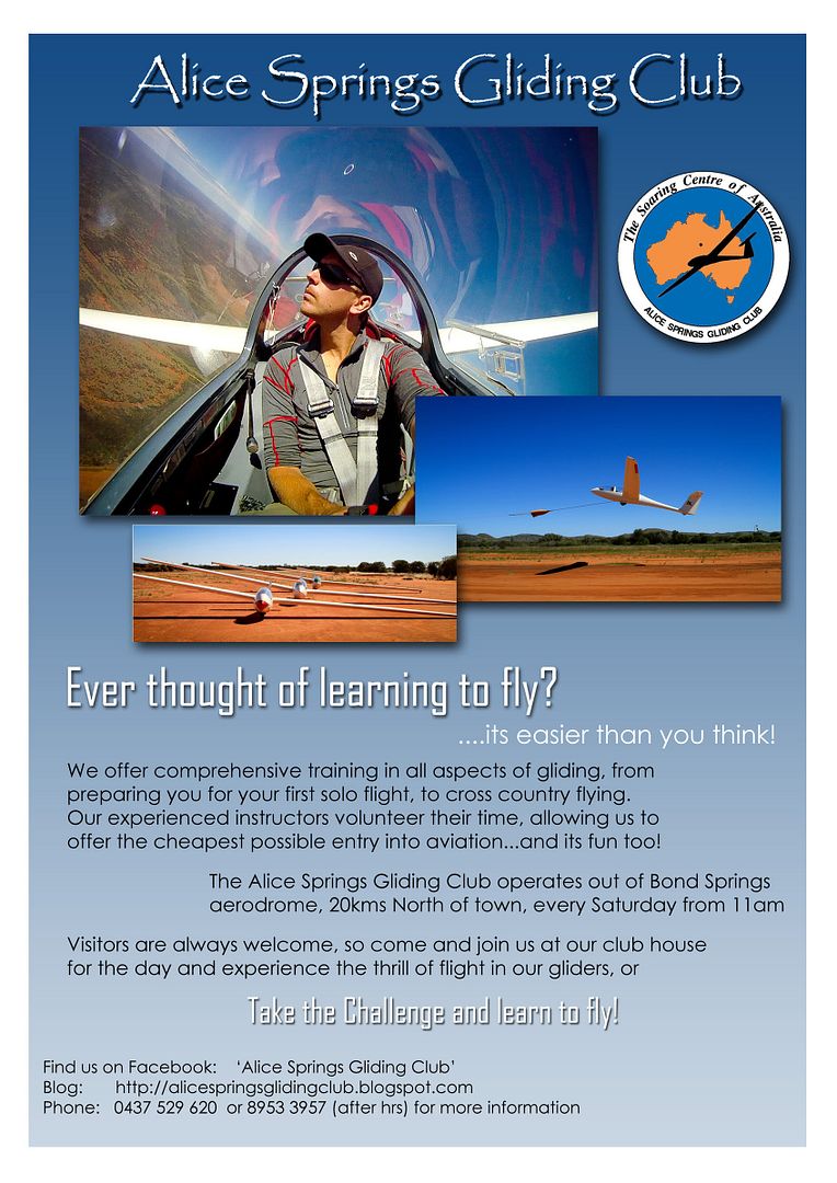 The Alice Springs Gliding Club wants YOU! and our recruiting campaign has started with this poster being placed around town. With the clubhouse repairs well underway, and a prime gliding season almost upon us, make sure you come out and fly with us this Spring!